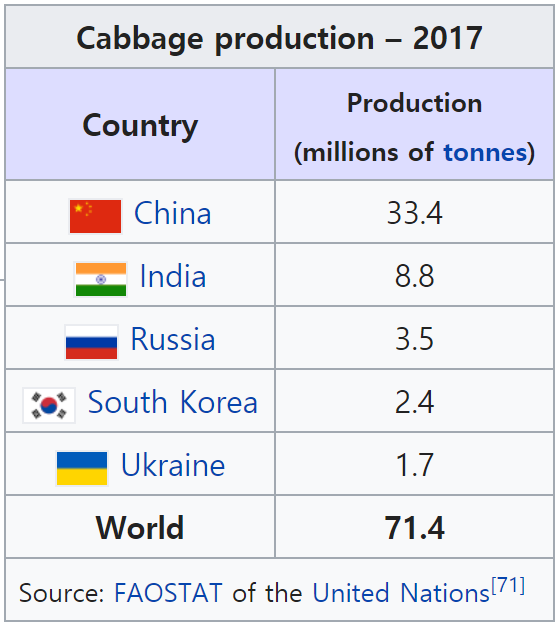 (설마 양배추가 주력 수출 농산물은 아닐 것이고, 생산량 순서대로 많이 먹겠지요 ? 배추 생산량만 보면 한국은 진짜 농업 강국입니다. 이 모든 것이 우리 국민들의 김치 사랑 덕분입니다.)