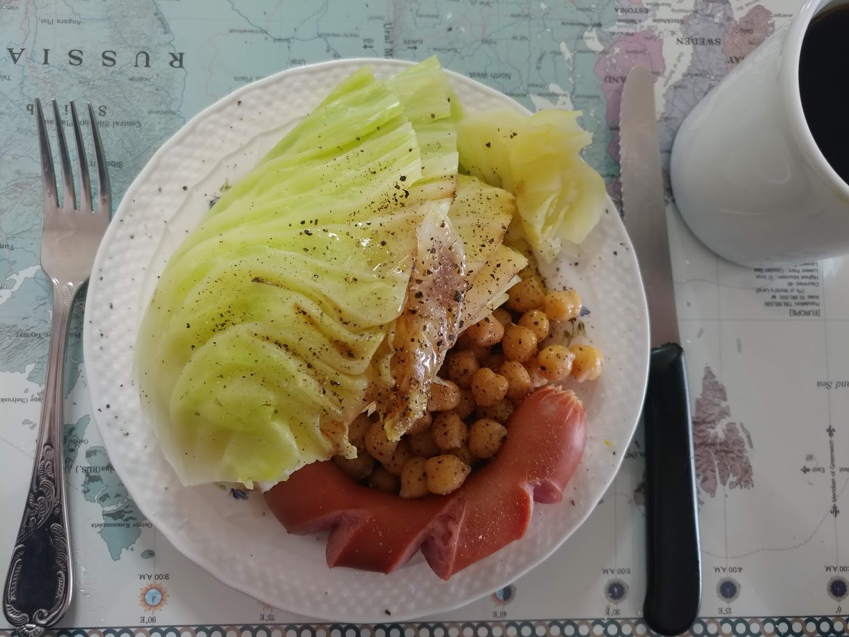 아래 사진은 제가 주말에 가끔씩 해먹는 아침 식사입니다. 만들기도 쉽고, 맛도 좋습니다. 양배추 1/4과 프랑크 소시지 하나를 냄비에 넣고 그냥 물을 절반쯤 넣고 5분간 삶으면 됩니다. 그 다음에 접시에 담고 양배추에 발사믹 식초와 올리브유, 후추와 소금을 뿌리면 끝입니다. 양배추는 값도 싸고 (1kg 한개가 대략 3천~4천원) 무엇보다 쉽게 상하지 않아서 보존에도 유리한데다 섬유질과 비타민이 풍부하고 결정적으로 맛도 좋고 건강에도 좋은 매우 착한 채소입니다.
