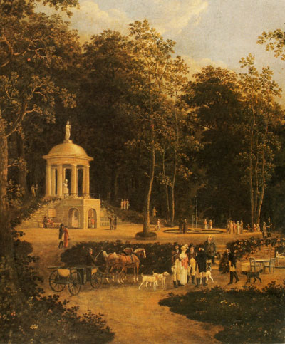 (이 그림 속 건물은 에르푸르트 근교에 있던 Napoleonshöhe, 즉 나폴레옹 언덕이라는 이름의 기념 건축물로서, 1811년 나폴레옹의 생일을 기념하여 목재에 석회를 입혀 만든 것입니다. 에르푸르트는 중세 이후 자유도시의 지위를 누리다 종교 전쟁 속에서 쇠퇴하여 독립을 잃었는데, 프랑스에게 영토를 빼앗긴 것에 대한 보상으로서 1802년 프로이센 영토가 되었습니다. 그러나 1806년 프로이센을 박살낸 나폴레옹은 에르푸르트를 라인 연방의 일원도 아닌, 황제 직할령(domaine réservé à l'empereur)으로 지정하여 프랑스 영토로 만들었습니다. 그에 대해 에르푸르트 시민들은 영광으로 생각했을까요? 1814년 에르푸르트가 함락되자 시민들은 이 나폴레옹 기념 건축물에 불을 질러 완전히 없애버린 것을 보면 전혀 그렇지 않았던 것 같습니다.)
