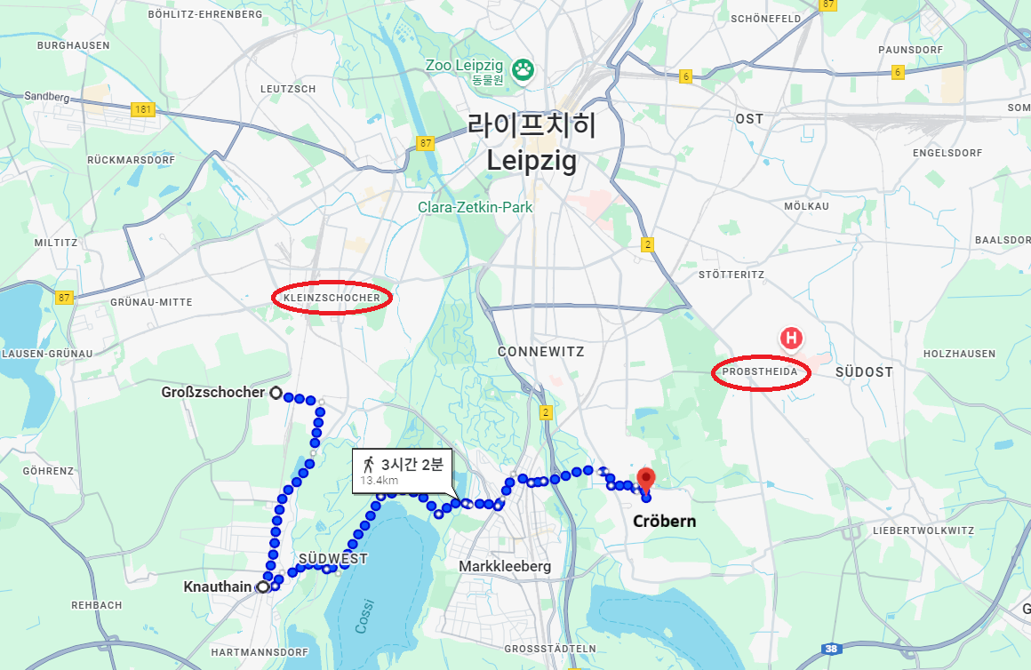 (클라인초허와 쇤나우 사이의 거리는 약 4km입니다. 클라인초허 밑에 그로스초허가 보입니다. Zschocher라는 이름은 그 일대의 슬라브계 원주민인 조르벤(Sorben)인들의 어휘에서 온 것으로서, 불로 태워 만든 개간지 정도의 뜻이라고 합니다. 작센 등 남동부 독일에 zsch라는 철자가 들어가는 이름들이 많은데, 그게 다 조르벤어에서 나온 것이라고 하네요.)