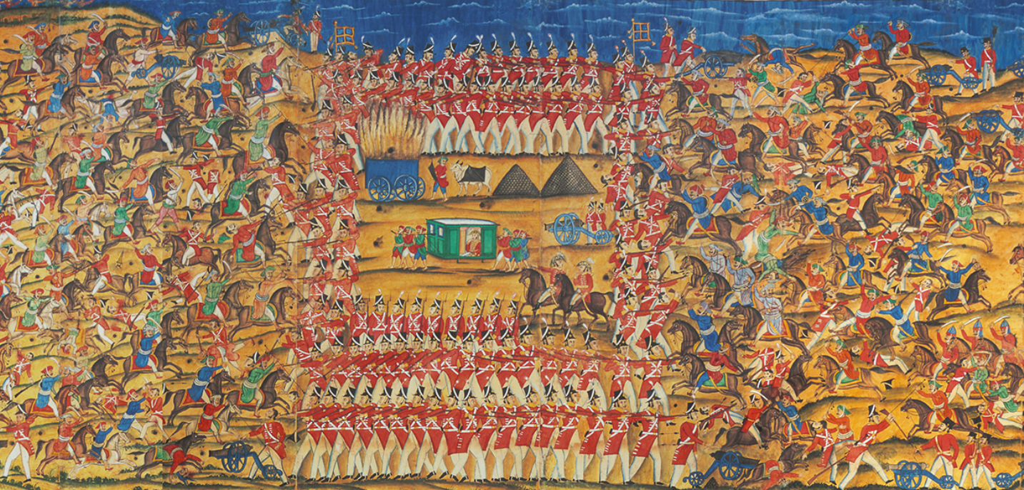 (티푸 술탄이 이 대승을 기념하기 위해 그리게 한 풀랄루어 전투도의 일부입니다. 원래 좌우로 훨씬 더 긴 그림인데, 이 가운데 부분에 영국군이 방진을 짜고 저항하는 모습이 묘사되어 있습니다.)