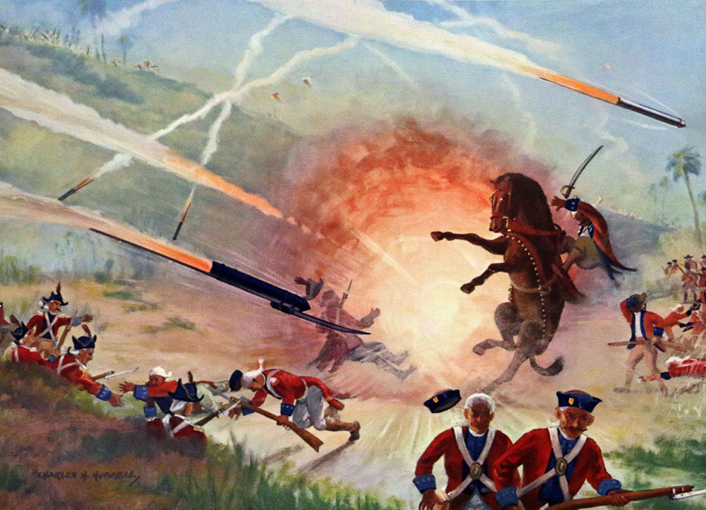 (1780년 풀랄루어 전투에서 마이소르 왕국군이 발사한 로켓 무기가 동인도회사군을 덮치는 장면입니다. 그림과는 달리, 당시 마이소르 왕국군의 로켓 무기는 폭발 탄두를 갖추고 있지는 않았고, 대지에 부딪힌 뒤 여기저기를 튀어다니며 병사들을 쓰러뜨렸다고 합니다.)