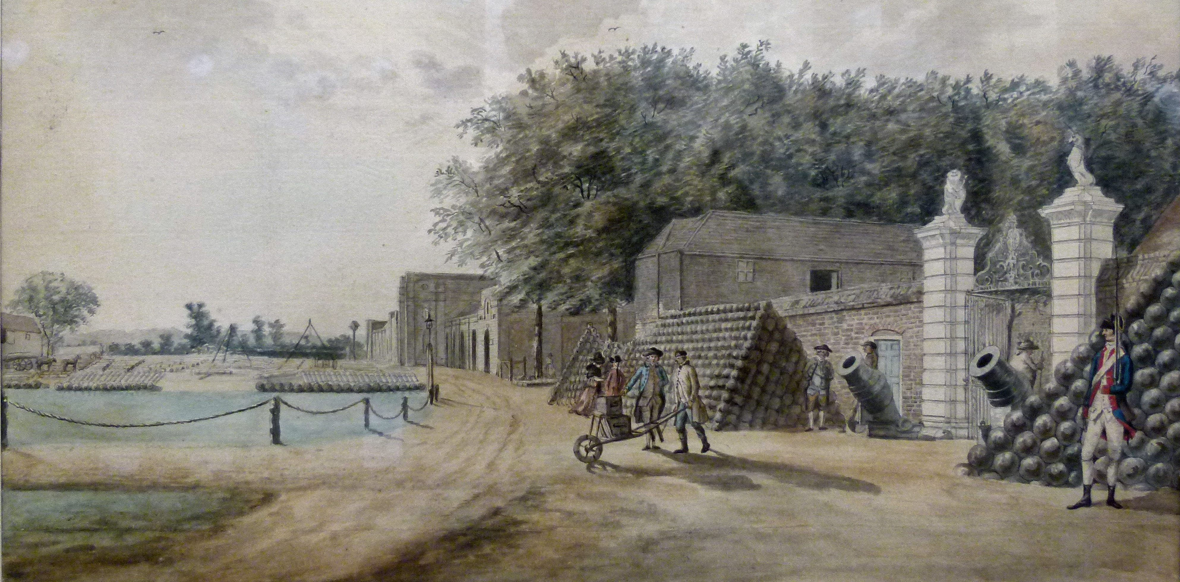 (1795년 경 울위치의 왕립 무기공장 및 연구소 문앞의 모습입니다. 그러니까 저기서 저렇게 탄약 나르던 사람들이 나중에 아스널 구단을 창립한 거지요. 포탄이 야적되어 있고, 저 뒤에는 대포들이 열지어 있습니다. James Cockburn의 작품입니다.)