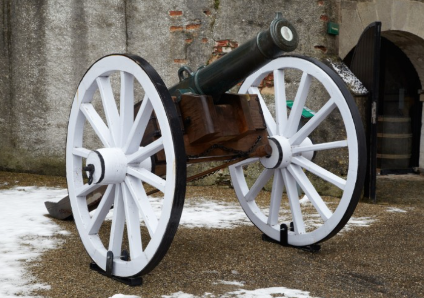 이런 비효율은 당시 대포들의 무게 때문이었습니다. 대포는 작용 반작용의 원리로 대포알을 쏘는 것이었으므로, 무거운 포탄을 멀리까지 쏘려면 대포가 무거워야 했습니다. 당시 영국 포병대가 주력으로 사용하던 9파운드 포의 경우 포신 무게만 약 690kg, 포가와 바퀴 등을 합하면 총 중량은 약 1,500kg에 달했습니다. 이렇게 무거운 포를 동원해서 쏘는 포탄의 무게는 글자 그대로 9파운드, 즉 약 4kg 정도였고요.