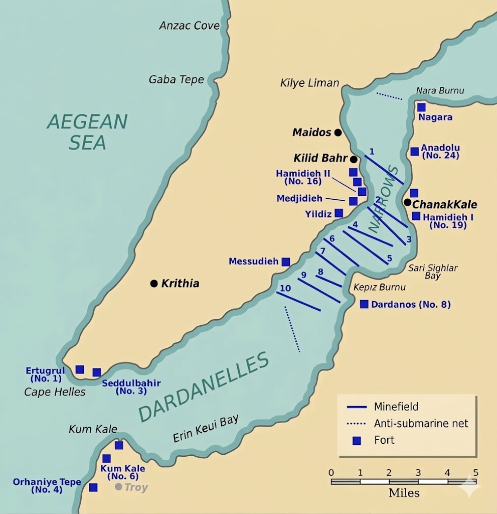 영불 연합군이 양측 해안에 지상군을 상륙시켜서 양쪽 해안의 포대를 먼저 제거한 뒤, 차근차근 기뢰를 제거하면서 전진한다면 기뢰 걱정은 크게 하지 않아도 되었음. 그러나 당장 서부 전선에 투입할 사단도 부족한 마당에 다다넬즈 해변에 투입할 지상군이 부족했으므로, 함대만으로 다다넬즈-보스포러스 해협을 돌파하기로 결정이 됨. 그래도 기뢰를 먼저 제거해야 돌파가 가능했고, 그러자면 소해정을 투입해야 하는데 양쪽 해안 포대들이 소해 작업을 보고만 있을 리가 없었음. 그러니까 먼저 영불 함대는 함포 사격을 통해 양쪽 해안 포대를 제거해야 했음.